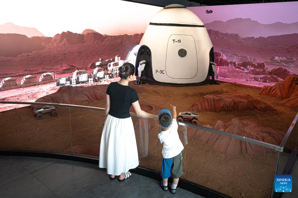 WUHAN, 18 julio, 2025 (Xinhua) -- Personas visitan una exposición de experiencia en ciencia planetaria con temática de ciencia ficción en el Museo de Ciencias de la Construcción de China, en Wuhan, en la provincia de Hubei, en el centro de China, el 18 de julio de 2025. La exposición inaugurada aquí el viernes cuenta con más de 10 piezas interactivas y más de 30 meteoritos en exhibición. Estará abierta hasta el 29 de marzo de 2026. (Xinhua/Xiao Yijiu)