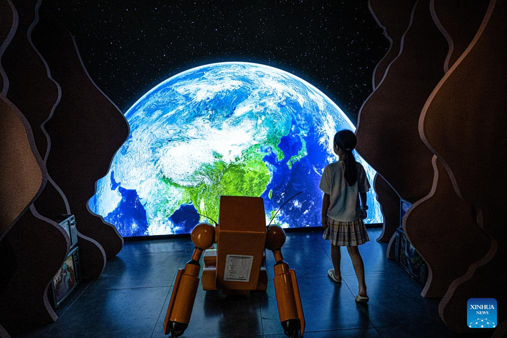 WUHAN, 18 julio, 2025 (Xinhua) -- Una niña visita una exposición de experiencia en ciencia planetaria con temática de ciencia ficción en el Museo de Ciencias de la Construcción de China, en Wuhan, en la provincia de Hubei, en el centro de China, el 18 de julio de 2025. La exposición inaugurada aquí el viernes cuenta con más de 10 piezas interactivas y más de 30 meteoritos en exhibición. Estará abierta hasta el 29 de marzo de 2026. (Xinhua/Xiao Yijiu)