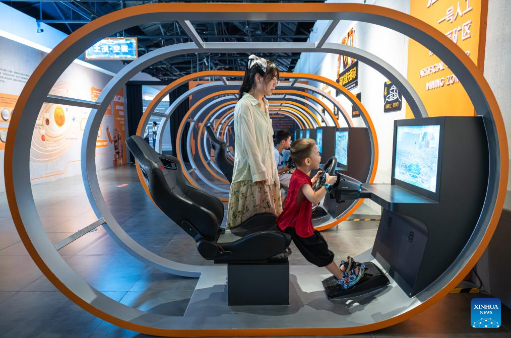 WUHAN, 18 julio, 2025 (Xinhua) -- Un niño conduce un vehículo de ingeniería simulado de Marte en una exposición de experiencia en ciencia planetaria con temática de ciencia ficción en el Museo de Ciencias de la Construcción de China, en Wuhan, en la provincia de Hubei, en el centro de China, el 18 de julio de 2025. La exposición inaugurada aquí el viernes cuenta con más de 10 piezas interactivas y más de 30 meteoritos en exhibición. Estará abierta hasta el 29 de marzo de 2026. (Xinhua/Xiao Yijiu)