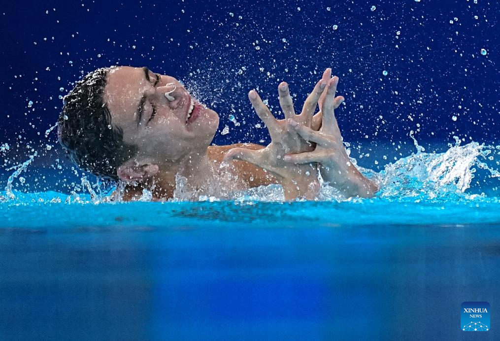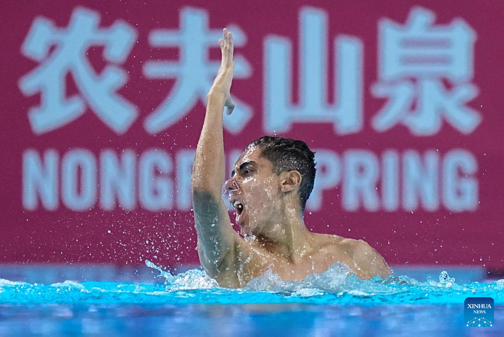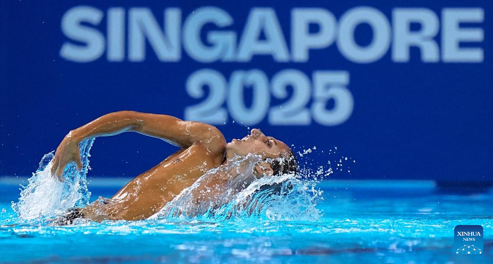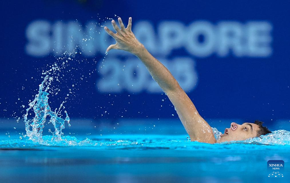 SINGAPUR, 19 julio, 2025 (Xinhua) -- Bernardo Barreto, de Brasil, compite durante la final de solo técnico masculino de natación artística en el Campeonato Mundial de Deportes Acuáticos, en Singapur, el 19 de julio de 2025. (Xinhua/Xia Yifang)