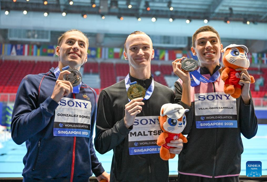 SINGAPUR, 19 julio, 2025 (Xinhua) -- El medallista de oro Aleksandr Maltsev (c), de Rusia, el medallista de plata Dennis González Boneu (i), de España, y el medallista de bronce Diego Villalobos Carrillo, de México, posan con sus medallas al término de la ceremonia de premiación de la final de solo técnico masculino de natación artística en el Campeonato Mundial de Deportes Acuáticos, en Singapur, el 19 de julio de 2025. (Xinhua/Xia Yifang)