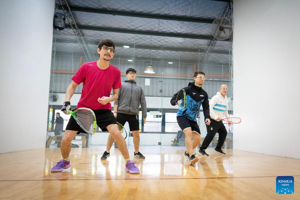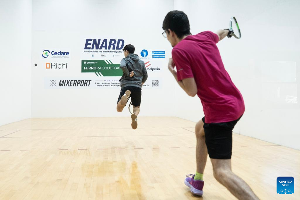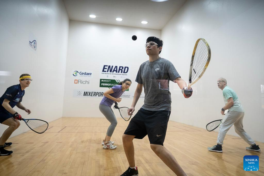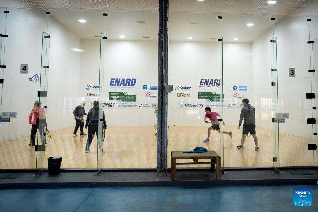 BUENOS AIRES, 19 julio, 2025 (Xinhua) -- Personas practican racquetball, en una de las canchas instaladas en el Club Ferro Carril Oeste, en la ciudad de Buenos Aires, capital de Argentina, el 19 de julio de 2025. El entrenador del seleccionado argentino de racquetball y uno de los principales dirigentes de este deporte afirmaron el sábado que esperan unos Juegos Mundiales "increíbles" el mes próximo en Chengdu, China. (Xinhua/Martín Zabala)