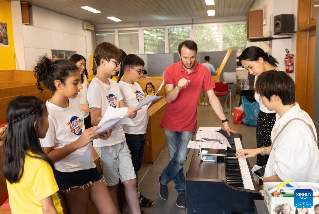 BOLONIA, 20 julio, 2025 (Xinhua) -- Imagen del 18 de julio de 2025 de niños del Coro Infantil de Hydrangea jugando en el Instituto Antoniano, en Bolonia, Italia. El Instituto Antoniano en Bolonia organizó una presentación especial conjunta el viernes, presentando a niños del Pequeño Coro del Antoniano de Italia y el Coro Infantil de Hydrangea de China. La presentación fue un punto importante del Campamento de Verano del Antoniano 2025, un intercambio cultural y musical de diez días, coorganizado por ambos coros. Guiados por los maestros del Antoniano, 22 niños de China y sus compañeros italianos conectaron a través de ensayos, juegos musicales y actividades prácticas. (Xinhua/Li Jing)
