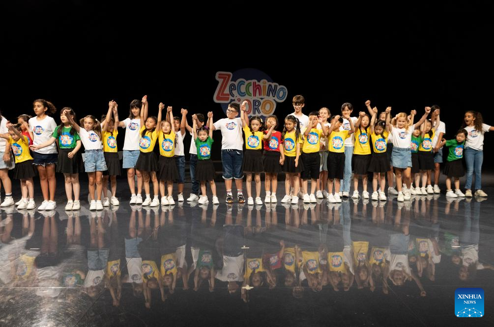 BOLONIA, 20 julio, 2025 (Xinhua) -- Imagen del 18 de julio de 2025 de niños del Pequeño Coro del Antoniano y el Coro Infantil de Hydrangea saludando a la audiencia, en Bolonia, Italia. El Instituto Antoniano en Bolonia organizó una presentación especial conjunta el viernes, presentando a niños del Pequeño Coro del Antoniano de Italia y el Coro Infantil de Hydrangea de China. La presentación fue un punto importante del Campamento de Verano del Antoniano 2025, un intercambio cultural y musical de diez días, coorganizado por ambos coros. Guiados por los maestros del Antoniano, 22 niños de China y sus compañeros italianos conectaron a través de ensayos, juegos musicales y actividades prácticas. (Xinhua/Li Jing)