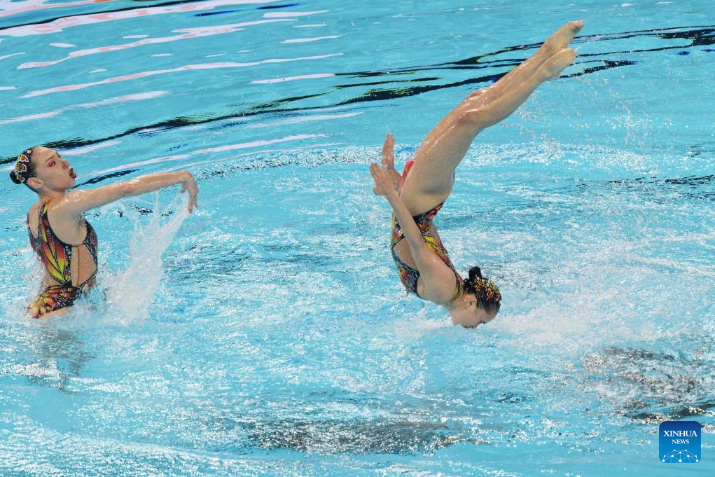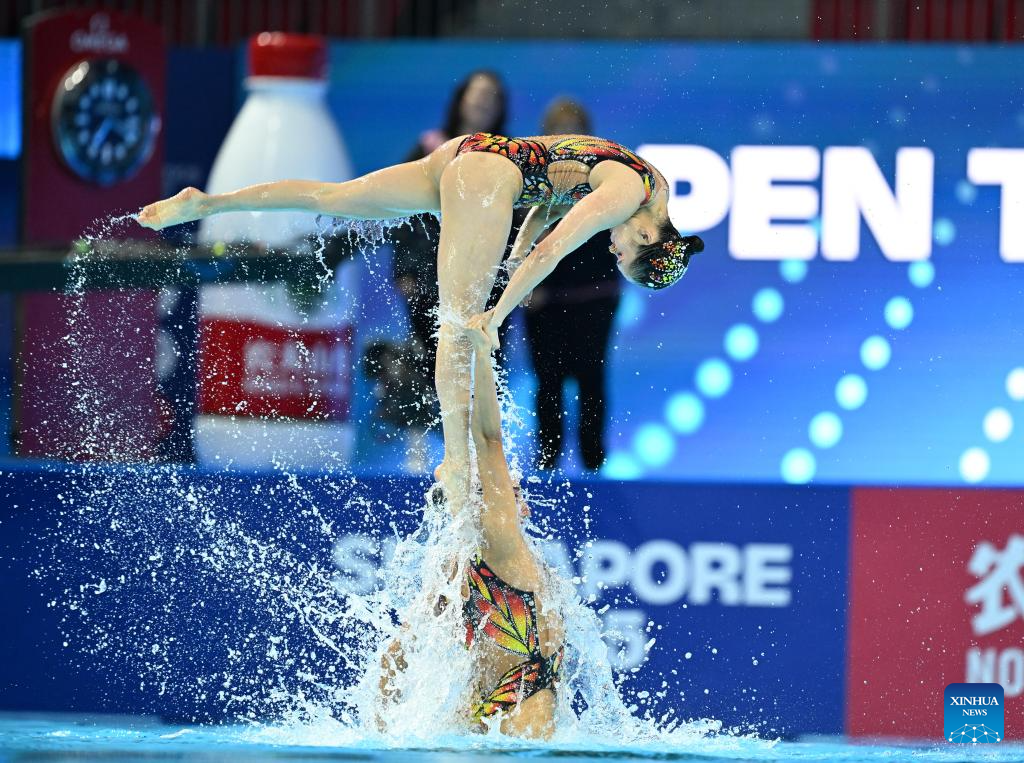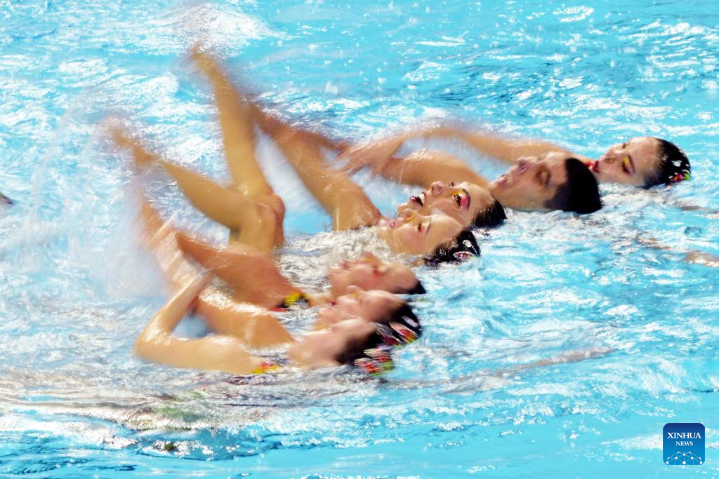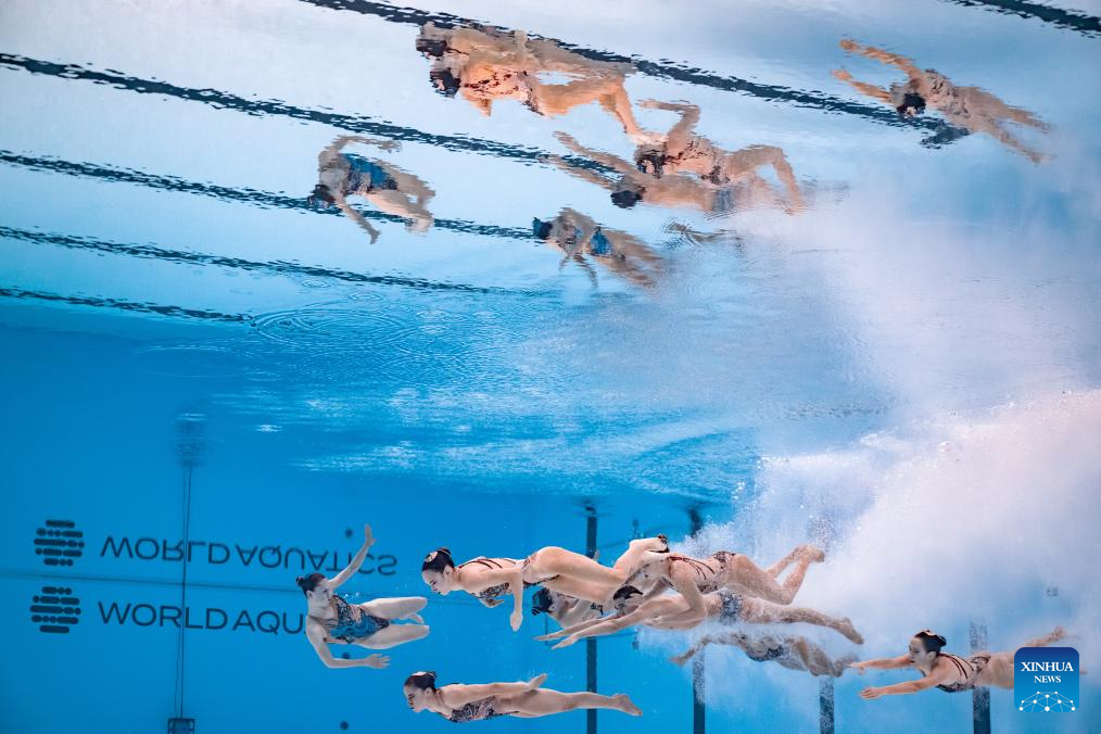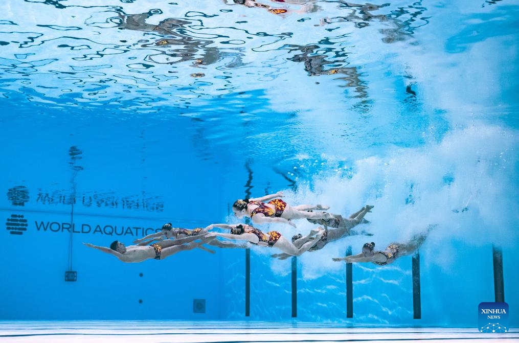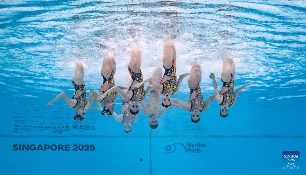 SINGAPUR, 21 julio, 2025 (Xinhua) -- Imagen del 20 de julio de 2025 del equipo de México realizando una presentación durante la final de equipo libre de natación artística, en el Campeonato Mundial de Deportes Acuáticos, en Singapur. (Xinhua/Xue Yuge)