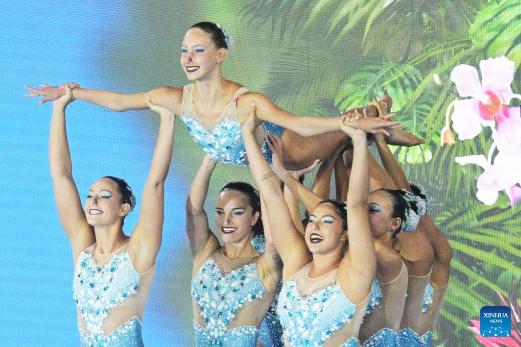 SINGAPUR, 21 julio, 2025 (Xinhua) -- Imagen del 20 de julio de 2025 del equipo de Brasil realizando una presentación durante la final de equipo libre de natación artística, en el Campeonato Mundial de Deportes Acuáticos, en Singapur. (Xinhua/Xia Yifang)