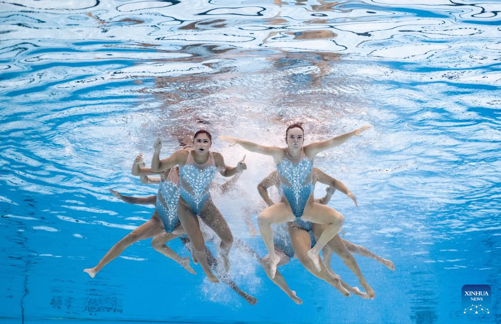 SINGAPUR, 21 julio, 2025 (Xinhua) -- Imagen del 20 de julio de 2025 del equipo de Chile realizando una presentación durante la final de equipo libre de natación artística, en el Campeonato Mundial de Deportes Acuáticos, en Singapur. (Xinhua/Xia Yifang)