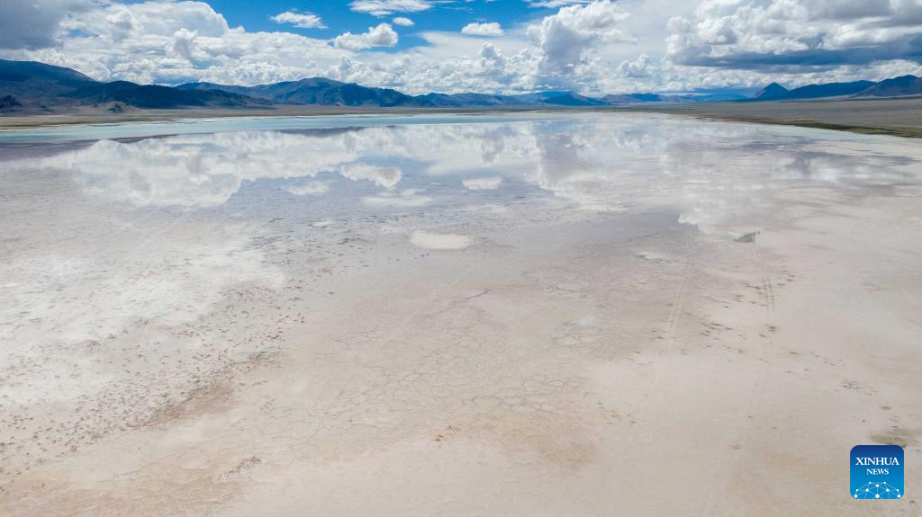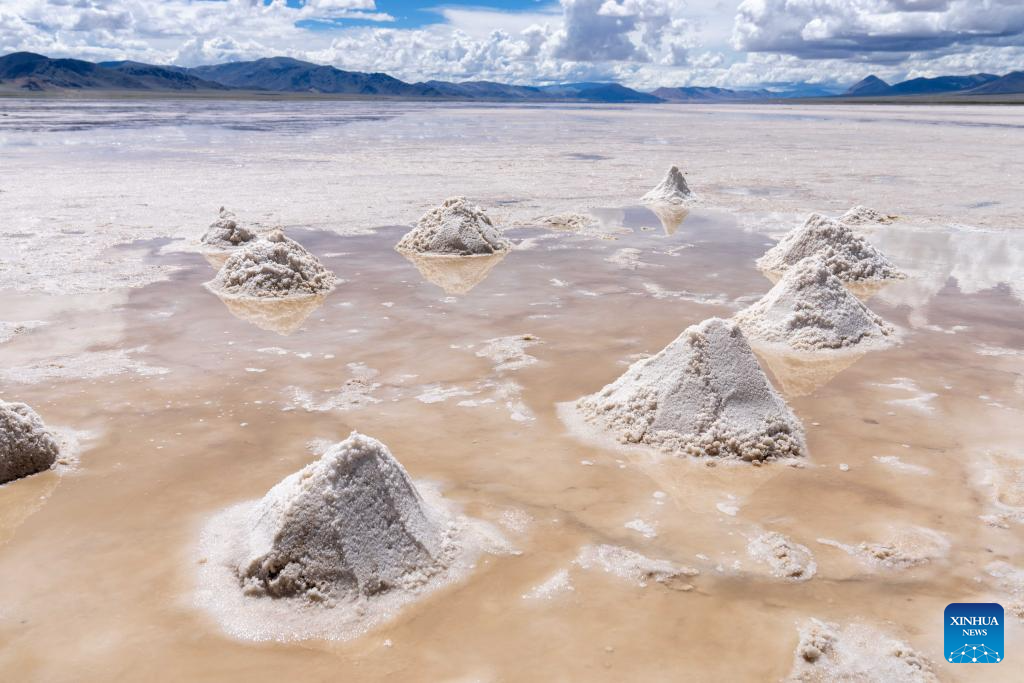 NGARI, 21 julio, 2025 (Xinhua) -- Vista aérea tomada con un dron el 20 de julio de 2025 de un lago de sal, en el distrito de Gegye, en la prefectura de Ngari, en la región autónoma de Xizang, en el suroeste de China. En 2018, la costumbre de Gegye de transportar sal fue incluida en la lista representativa del patrimonio cultural inmaterial de la región autónoma de Xizang. (Xinhua/Tenzing Nima Qadhup)