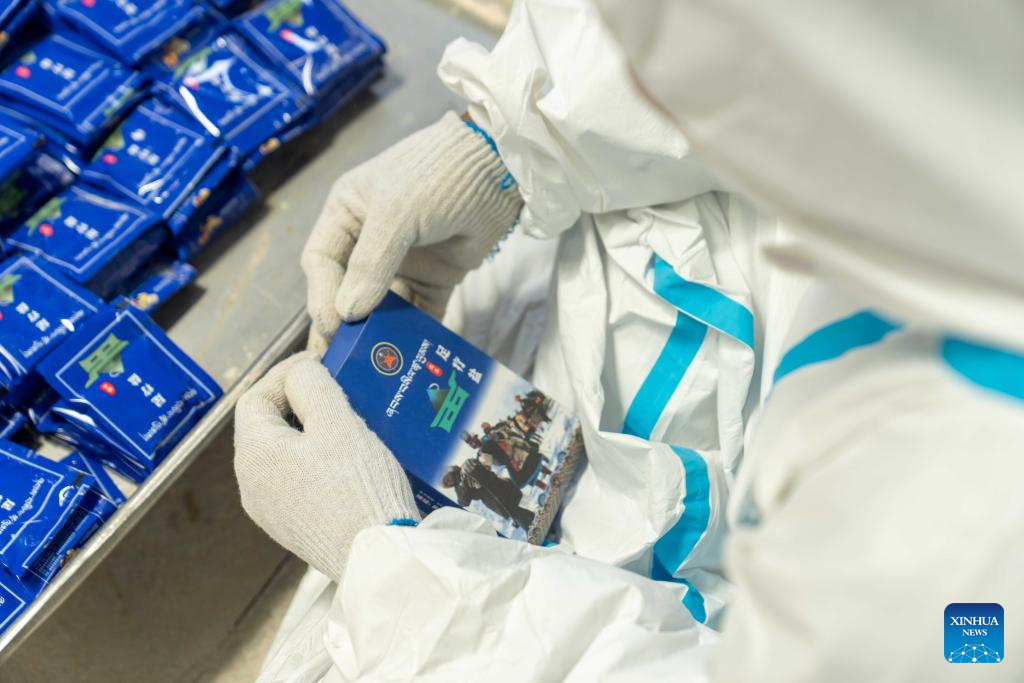 NGARI, 21 julio, 2025 (Xinhua) -- Imagen del 20 de julio de 2025 de un empleado empaquetando sal en una planta de procesamiento de sal cruda, en el distrito de Gegye, en la prefectura de Ngari, en la región autónoma de Xizang, en el suroeste de China. En 2018, la costumbre de Gegye de transportar sal fue incluida en la lista representativa del patrimonio cultural inmaterial de la región autónoma de Xizang. (Xinhua/Tenzing Nima Qadhup)