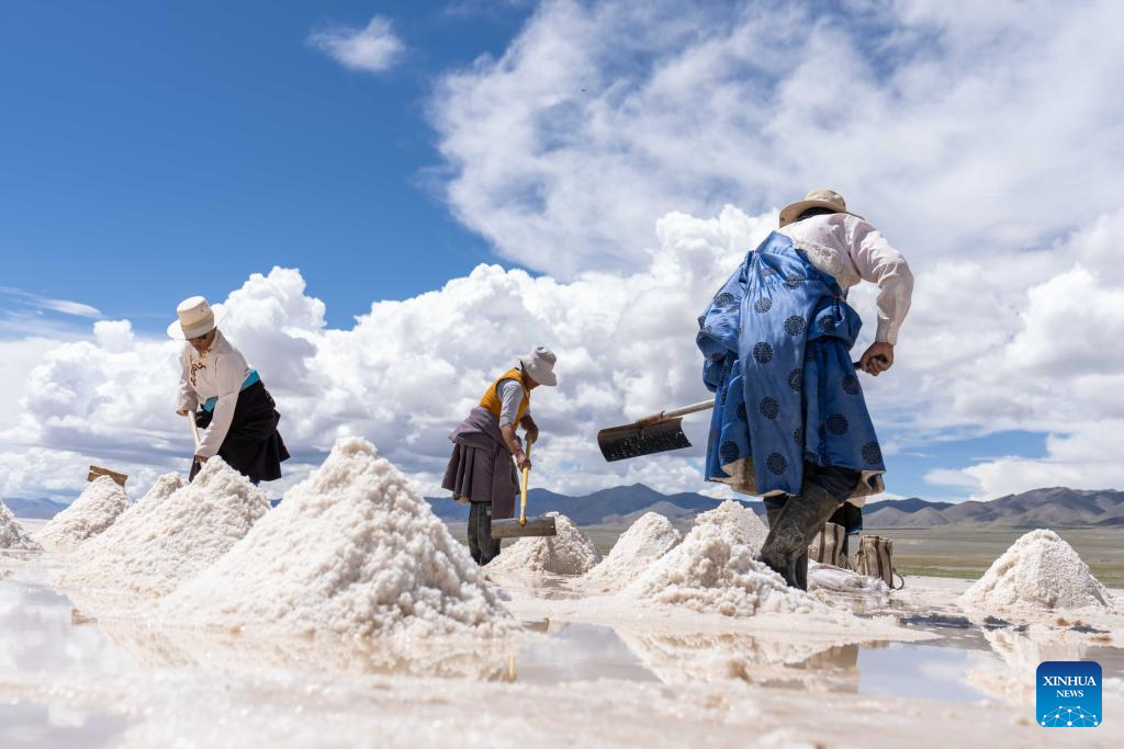 NGARI, 21 julio, 2025 (Xinhua) -- Imagen del 20 de julio de 2025 de pastores cosechando sal, en el distrito de Gegye, en la prefectura de Ngari, en la región autónoma de Xizang, en el suroeste de China. En 2018, la costumbre de Gegye de transportar sal fue incluida en la lista representativa del patrimonio cultural inmaterial de la región autónoma de Xizang. (Xinhua/Tenzing Nima Qadhup)