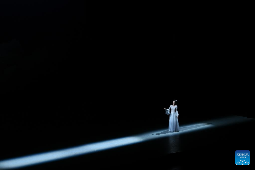 URUMQI, 21 julio, 2025 (Xinhua) -- Imagen del 20 de julio de 2025 de la actriz china, Tong Liya, realizando una presentación de un drama de danza durante el 7 Festival Internacional de Danza de Xinjiang de China, en el Salón del Pueblo de Xinjiang, en Urumqi, capital de la región autónoma uygur de Xinjiang, en el noroeste de China. El 7 Festival Internacional de Danza de Xinjiang de China se inauguró aquí el domingo, con 52 presentaciones a lo largo de 17 días hasta el 5 de agosto. (Xinhua/Xin Yuewei)