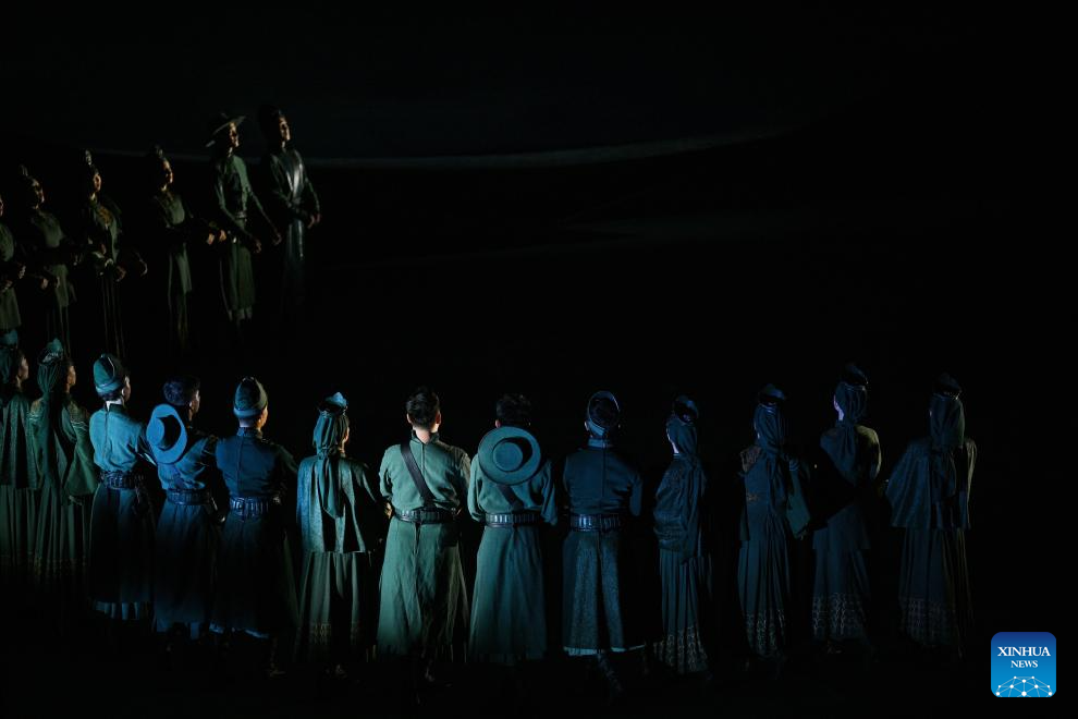 URUMQI, 21 julio, 2025 (Xinhua) -- Imagen del 20 de julio de 2025 de actores realizando una presentación de un drama de danza durante el 7 Festival Internacional de Danza de Xinjiang de China, en el Salón del Pueblo de Xinjiang, en Urumqi, capital de la región autónoma uygur de Xinjiang, en el noroeste de China. El 7 Festival Internacional de Danza de Xinjiang de China se inauguró aquí el domingo, con 52 presentaciones a lo largo de 17 días hasta el 5 de agosto. (Xinhua/Xin Yuewei)