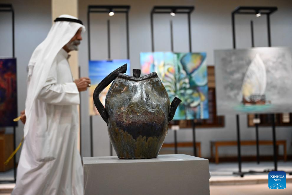 CIUDAD DE KUWAIT, 22 julio, 2025 (Xinhua) -- Imagen del 21 de julio de 2025 de un hombre visitando la exposición "Antigüedades de Kuwait en Colores", en la Ciudad de Kuwait, Kuwait. El Consejo Nacional para Cultura, Artes y Letras de Kuwait presentó la exposición de arte de verano con 38 obras de 30 artistas. La exposición durará hasta el 27 de julio. (Xinhua/Asad)