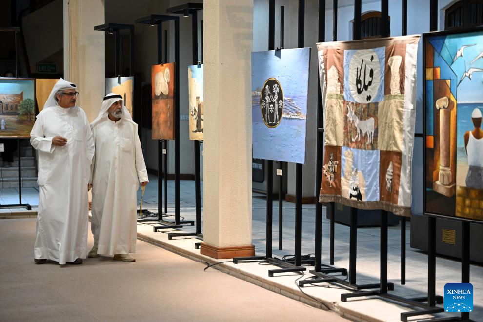 CIUDAD DE KUWAIT, 22 julio, 2025 (Xinhua) -- Imagen del 21 de julio de 2025 de personas visitando la exposición "Antigüedades de Kuwait en Colores", en la Ciudad de Kuwait, Kuwait. El Consejo Nacional para Cultura, Artes y Letras de Kuwait presentó la exposición de arte de verano con 38 obras de 30 artistas. La exposición durará hasta el 27 de julio. (Xinhua/Asad)