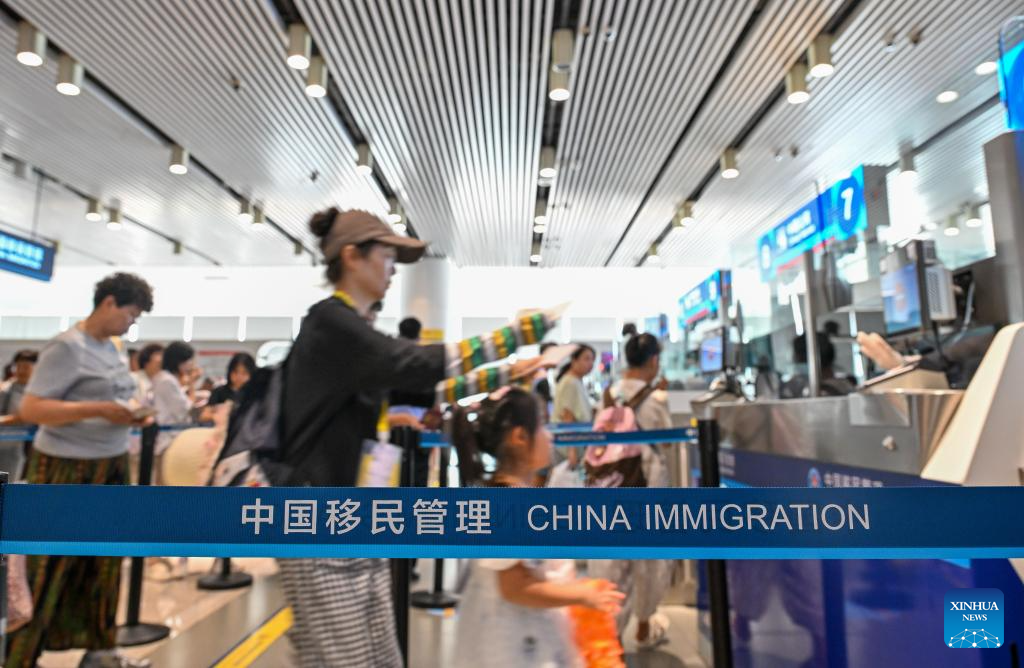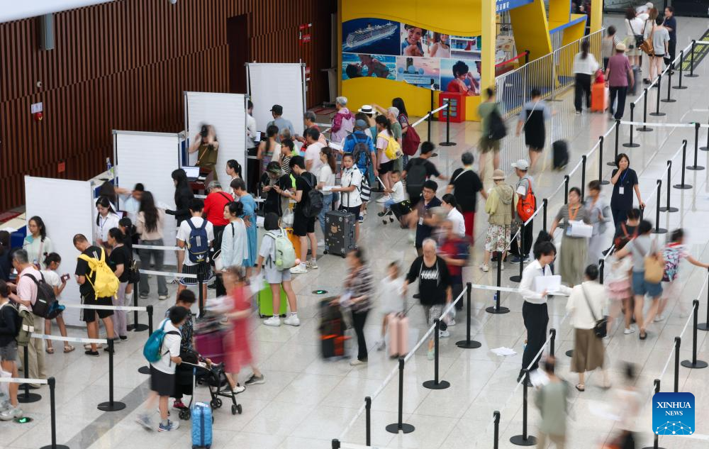 TIANJIN, 23 julio, 2025 (Xinhua) -- Viajeros se registran en el Puerto Base de Cruceros Internacionales de Tianjin, en Tianjin, en el norte de China, el 23 de julio de 2025. Según datos oficiales, el puerto de cruceros de Tianjin ha facilitado la entrada y salida de casi 40.000 pasajeros desde julio de este año, junto con 16 visitas de cruceros, lo que marca un aumento interanual del 17 por ciento. (Xinhua/Sun Fanyue)