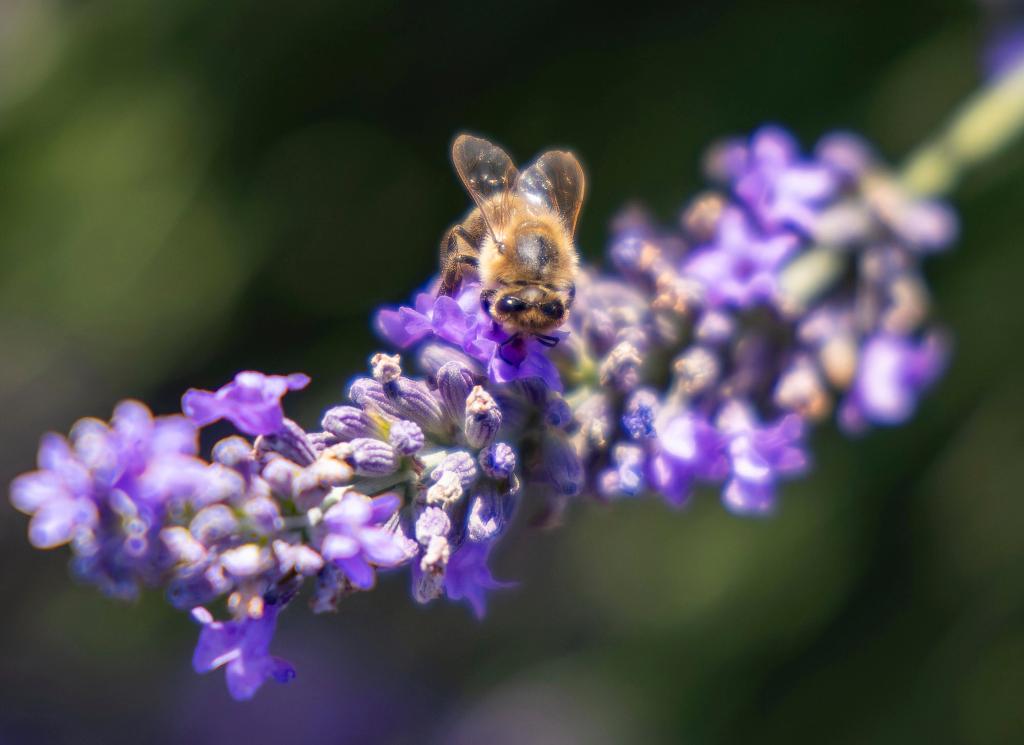 MILTON, 23 julio, 2025 (Xinhua) -- Imagen del 22 de julio de 2025 de una abeja melífera posándose sobre flores de lavanda en un campo de lavanda, en Milton, Ontario, Canadá. (Xinhua/Zou Zheng)