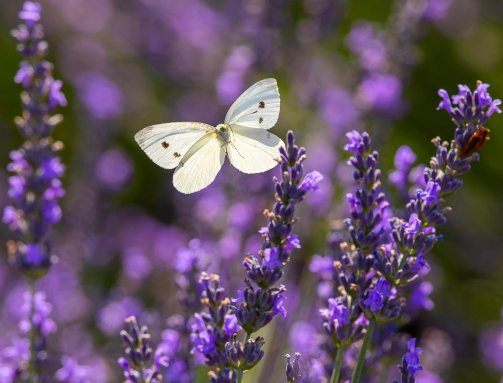 MILTON, 23 julio, 2025 (Xinhua) -- Imagen del 22 de julio de 2025 de una mariposa de la col volando entre flores de lavanda en un campo de lavanda, en Milton, Ontario, Canadá. (Xinhua/Zou Zheng)