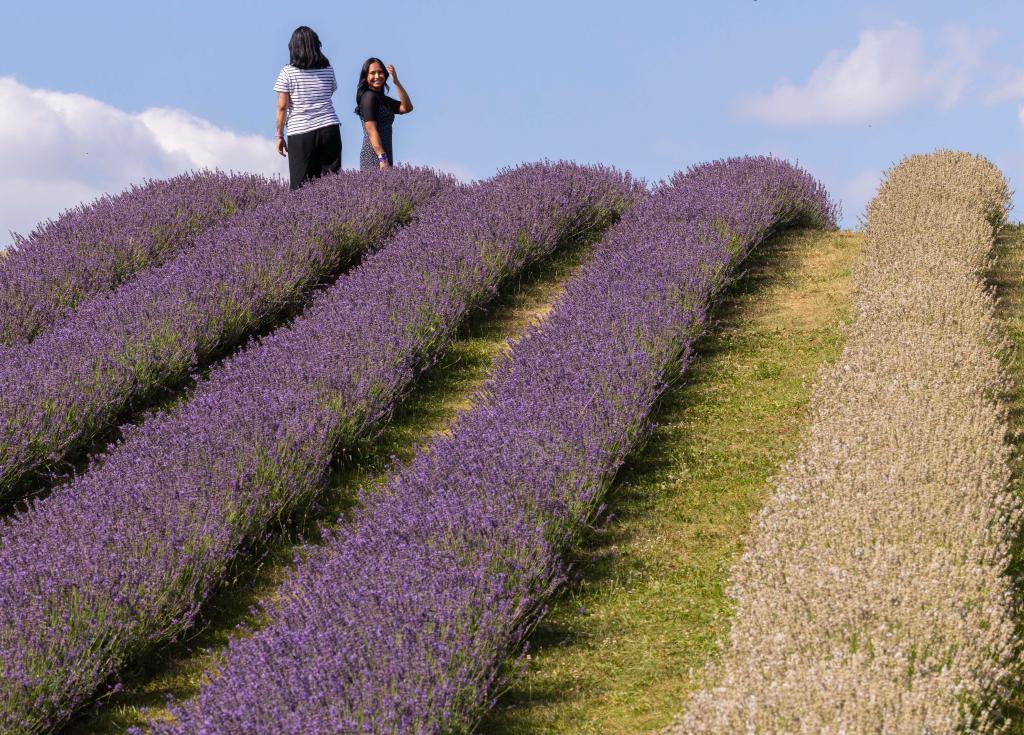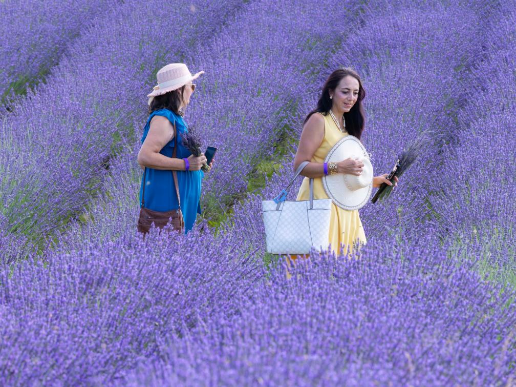 MILTON, 23 julio, 2025 (Xinhua) -- Imagen del 22 de julio de 2025 de visitantes caminando por un campo de lavanda, en Milton, Ontario, Canadá. (Xinhua/Zou Zheng)