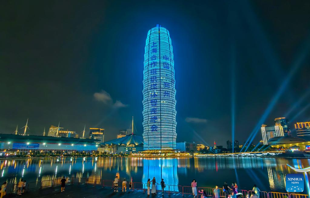ZHENGZHOU, 24 julio, 2025 (Xinhua) -- Imagen del 23 de julio de 2025 de un edificio iluminado visto cerca del Centro Internacional de Convenciones y Exposiciones de Zhengzhou, sede de la Cumbre de Medios de Comunicación y Think Tanks de la Organización de Cooperación de Shanghai (OCS), en Zhengzhou, en la provincia de Henan, en el centro de China. Con el lema "Defender el 'Espíritu de Shanghai' para construir un hogar más hermoso", la Cumbre de Medios de Comunicación y Think Tanks de la OCS se realiza aquí del 23 al 27 de julio. (Xinhua/Gu Yu)