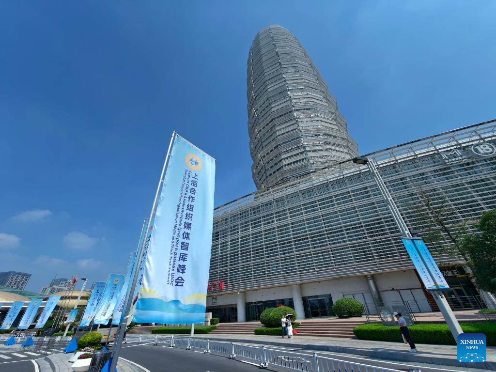 ZHENGZHOU, 25 julio, 2025 (Xinhua) -- Imagen del 25 de julio de 2025 de banderas de la Cumbre de Medios de Comunicación y Think Tanks de la Organización de Cooperación de Shanghai (OCS), en Zhengzhou, capital de la provincia de Henan, en el centro de China. La cumbre se realiza aquí del 23 al 27 de julio. (Xinhua/Bai Xueqi)