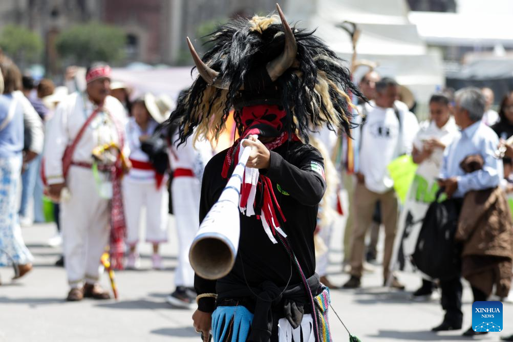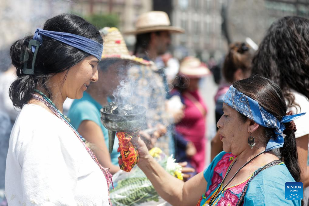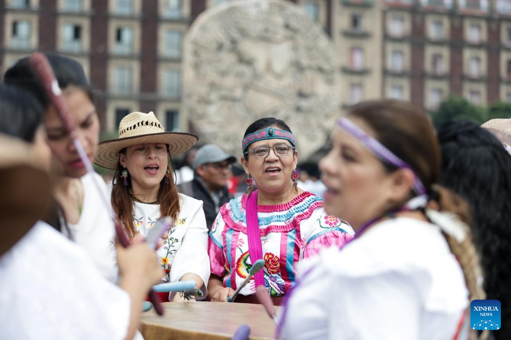 CIUDAD DE MEXICO, 25 julio, 2025 (Xinhua) -- Mujeres participan en una celebración en el marco de la conmemoración de los 700 años de la fundación de México-Tenochtitlan, en el Zócalo de la Ciudad de México, capital de México, el 25 de julio de 2025. (Xinhua/Francisco Cañedo)