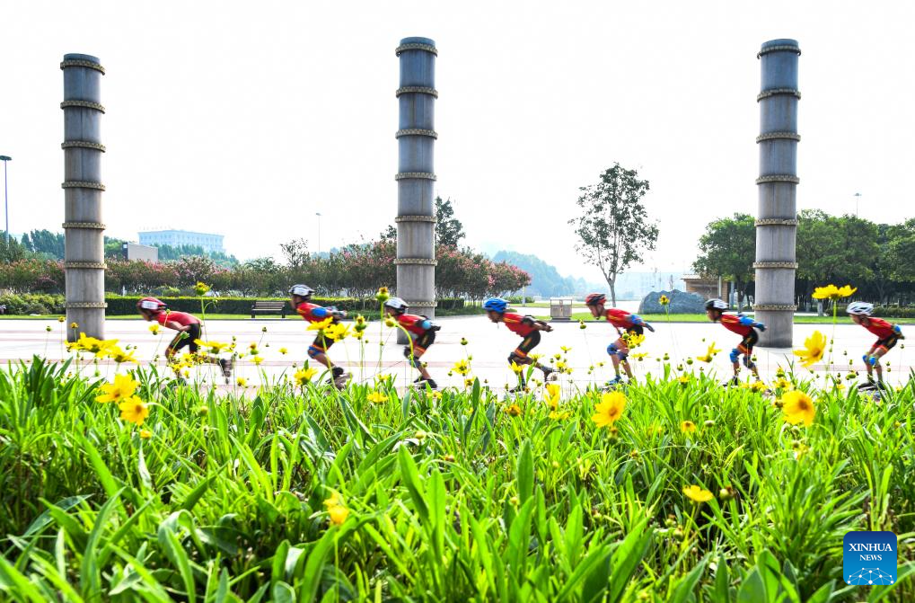 BEIJING, 26 julio, 2025 (Xinhua) -- Niños practican patinaje sobre ruedas en una plaza, en la ciudad de Jiyuan, en la provincia de Henan, en el centro de China, el 26 de julio de 2025. Niños participan en diversas actividades durante las vacaciones de verano en todo el país. (Xinhua/Miao Qiunao)
