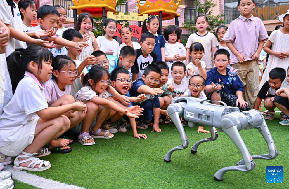 BEIJING, 26 julio, 2025 (Xinhua) -- Imagen del 25 de julio de 2025 de niños interactuando con un perro robótico, en la ciudad de Meishan, en la provincia de Sichuan, en el suroeste de China. Niños participan en diversas actividades durante las vacaciones de verano en todo el país. (Xinhua/Pan Jianyong)