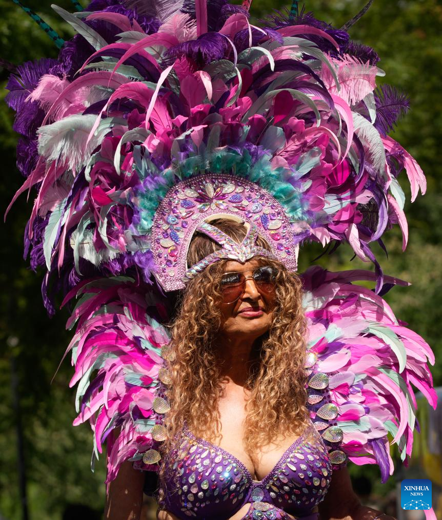 COQUITLAM, 27 julio, 2025 (Xinhua) -- Imagen del 26 de julio de 2025 de una juerguista portando un disfraz mientras participa en el Desfile de Carnaval en el Festival Días del Caribe 2025, en Coquitlam, Columbia Británica, Canadá. El evento de dos días contó con música en vivo, presentaciones culturales, un desfile, cocina tradicional caribeña, y un mercado de artesanías, resaltando la vitalidad de la cultura caribeña. (Xinhua/Liang Sen)