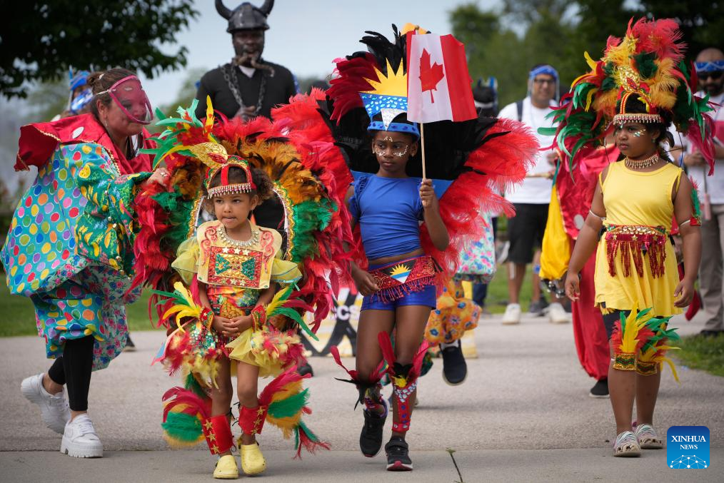 COQUITLAM, 27 julio, 2025 (Xinhua) -- Imagen del 26 de julio de 2025 de niñas portando disfraces mientras participan en el Desfile de Carnaval en el Festival Días del Caribe 2025, en Coquitlam, Columbia Británica, Canadá. El evento de dos días contó con música en vivo, presentaciones culturales, un desfile, cocina tradicional caribeña, y un mercado de artesanías, resaltando la vitalidad de la cultura caribeña. (Xinhua/Liang Sen)