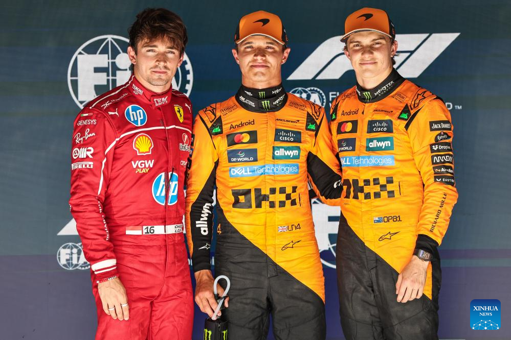 STAVELOT, 27 julio, 2025 (Xinhua) -- Imagen del 26 de julio de 2025 del ganador de la pole position, el piloto británico de la escudería McLaren, Lando Norris (c), posando con el ganador del segundo lugar, el piloto australiano de la escudería McLaren, Oscar Piastri (d), y el ganador del tercer lugar, el piloto monegasco de la escudería Ferrari, Charles Leclerc (i), durante la ceremonia de premiación de la sesión de clasificación del Gran Premio de Bélgica de Fórmula Uno, en el circuito de Spa-Francorchamps, en Stavelot, Bélgica. (Xinhua/Qian Jun)