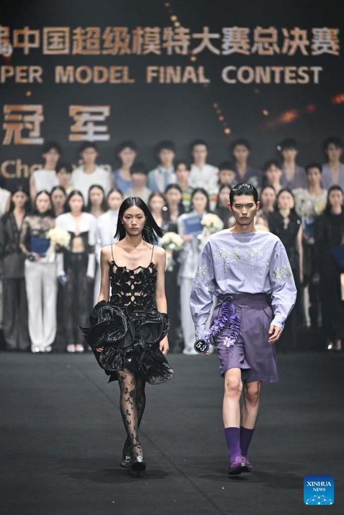 SHANGHAI, 27 julio, 2025 (Xinhua) -- Imagen del 26 de julio de 2025 de concursantes presentando creaciones de moda durante el 19 Concurso Final de Súper Modelos de China, en Shanghai, en el este de China. El concurso final se celebró aquí el sábado, con la participación de 60 modelos seleccionados de entre casi 10.000 concursantes. (Xinhua/Chen Haoming)