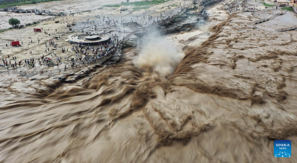 JIXIAN, 27 julio, 2025 (Xinhua) -- Vista aérea tomada por un dron el 27 de julio de 2025 de personas visitando la cascada Hukou en el río Amarillo, en el distrito de Jixian, en la provincia de Shanxi, en el norte de China. La cascada Hukou está experimentando un aumento del caudal de agua últimamente. (Xinhua/Liu Hongda)