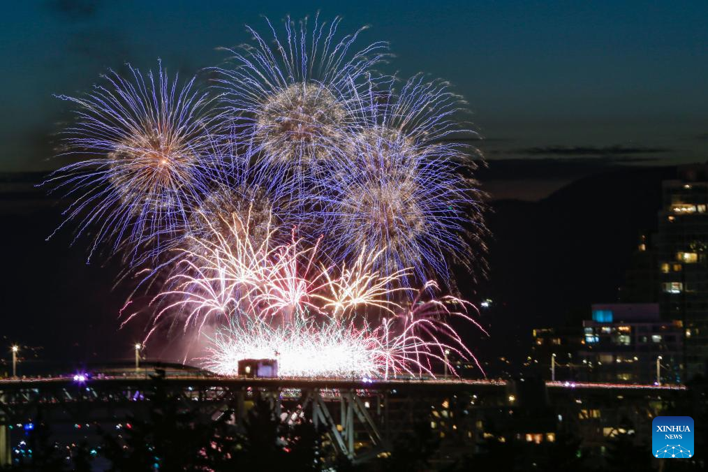 VANCOUVER, 27 julio, 2025 (Xinhua) -- Imagen del 26 de julio de 2025 de fuegos artificiales iluminando el cielo durante la Celebración de la Luz 2025 en English Bay, en Vancouver, Columbia Británica, Canadá. Un espectáculo de fuegos artificiales presentado por Team Nova Scotia iluminó el cielo el sábado, marcando la presentación final de la Celebración de la Luz 2025. (Xinhua/Liang Sen)