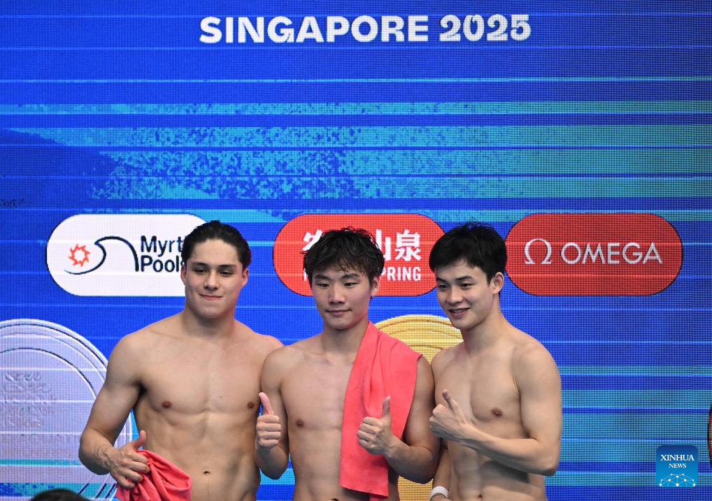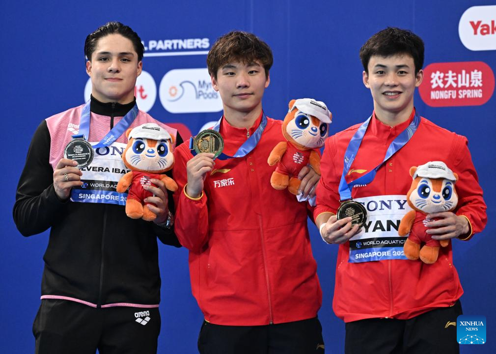 SINGAPUR, 27 julio, 2025 (Xinhua) -- El medallista de oro, Zheng Jiuyuan (c), de China, el medallista de plata, Osmar Olvera Ibarra (i), de México y el medallista de bronce, Yan Siyu, de China, posan para fotografías durante la ceremonia de premiación del trampolín 1m masculino de clavados en el Campeonato Mundial de Deportes Acuáticos, en Singapur, el 27 de julio de 2025. (Xinhua/Xue Yuge)