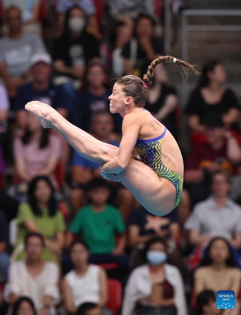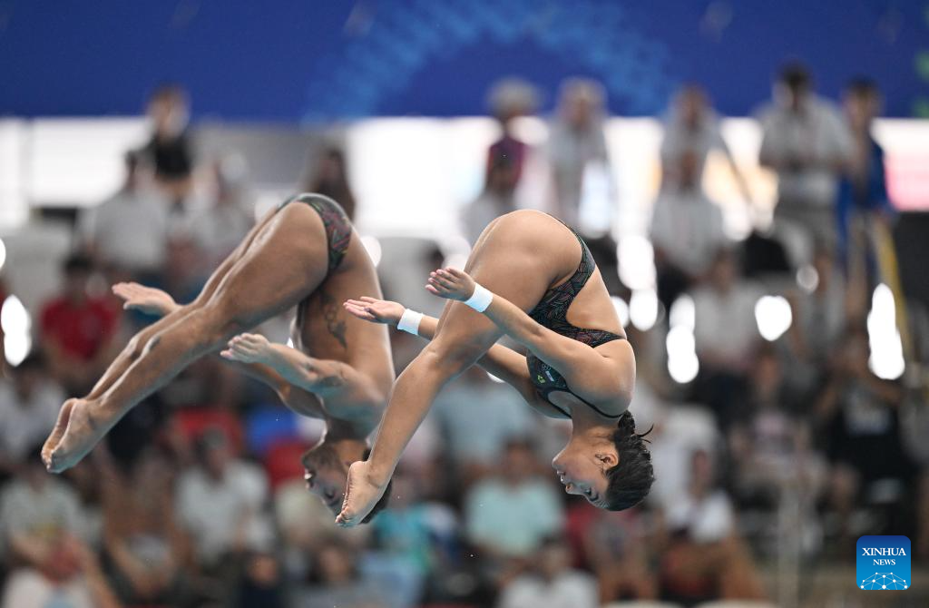 SINGAPUR, 27 julio, 2025 (Xinhua) -- Imagen del 26 de julio de 2025 de Luana Lira, de Brasil, compitiendo durante la final de 3m y 10m por equipos mixtos de clavados en el Campeonato Mundial de Deportes Acuáticos, en Singapur. (Xinhua/Luo Yuan)