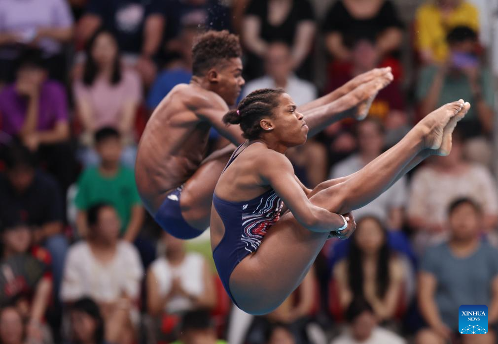 SINGAPUR, 27 julio, 2025 (Xinhua) -- Imagen del 26 de julio de 2025 de Bernaldo Arias Peña/Anisley García Navarro (frente), de Cuba, compitiendo durante la final de 3m y 10m por equipos mixtos de clavados en el Campeonato Mundial de Deportes Acuáticos, en Singapur. (Xinhua/Luo Yuan)