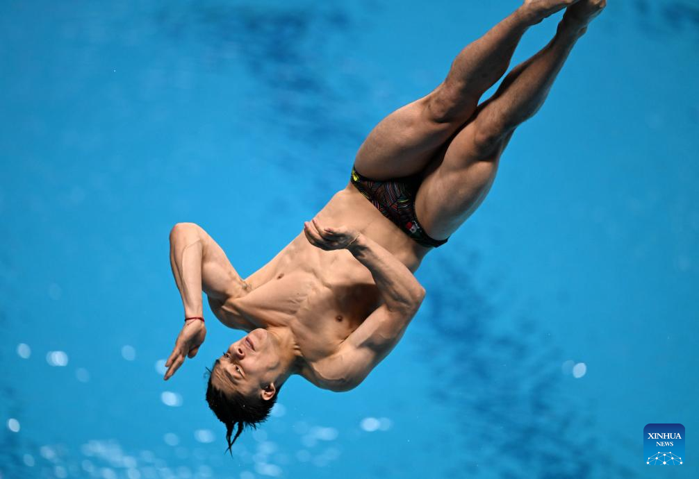 SINGAPUR, 27 julio, 2025 (Xinhua) -- Osmar Olvera Ibarra, de México, compite durante la final de trampolín 1m masculino de clavados en el Campeonato Mundial de Deportes Acuáticos, en Singapur, el 27 de julio de 2025. (Xinhua/Xue Yuge)