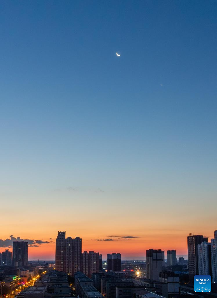HEILONGJIANG, 28 julio, 2025 (Xinhua) -- Imagen del 22 de julio de 2025 de Venus visto en su mayor altitud anual junto a la luna creciente, en la ciudad de Jiamusi, en la provincia de Heilongjiang, en el noreste de China. (Xinhua/Chen Zhiguo)