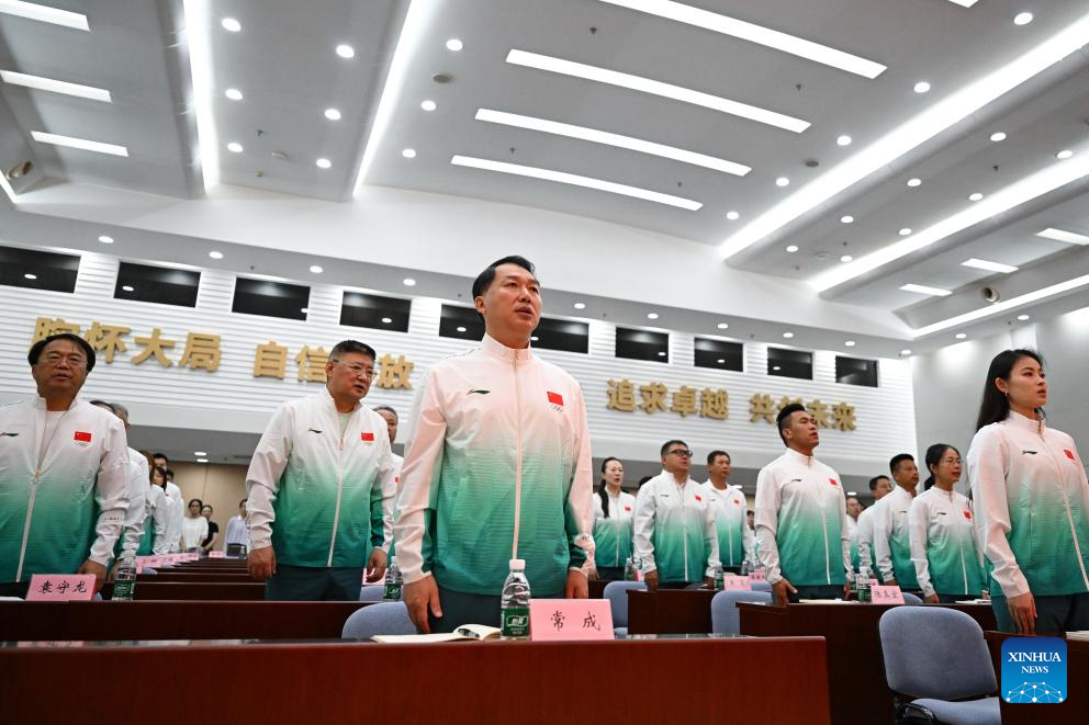 BEIJING, 29 julio, 2025 (Xinhua) -- Imagen del 29 de julio de 2025 de la ceremonia de presentación de la delegación china para los próximos Juegos Mundiales de 2025 en Chengdu, en Beijing, capital de China. China presentó el martes su delegación de 489 miembros, que incluye a 321 atletas. El equipo chino estará en 152 competencias de 28 deportes, lo que significará la mayor participación de China en la historia de los Juegos Mundiales. (Xinhua/Song Yanhua)