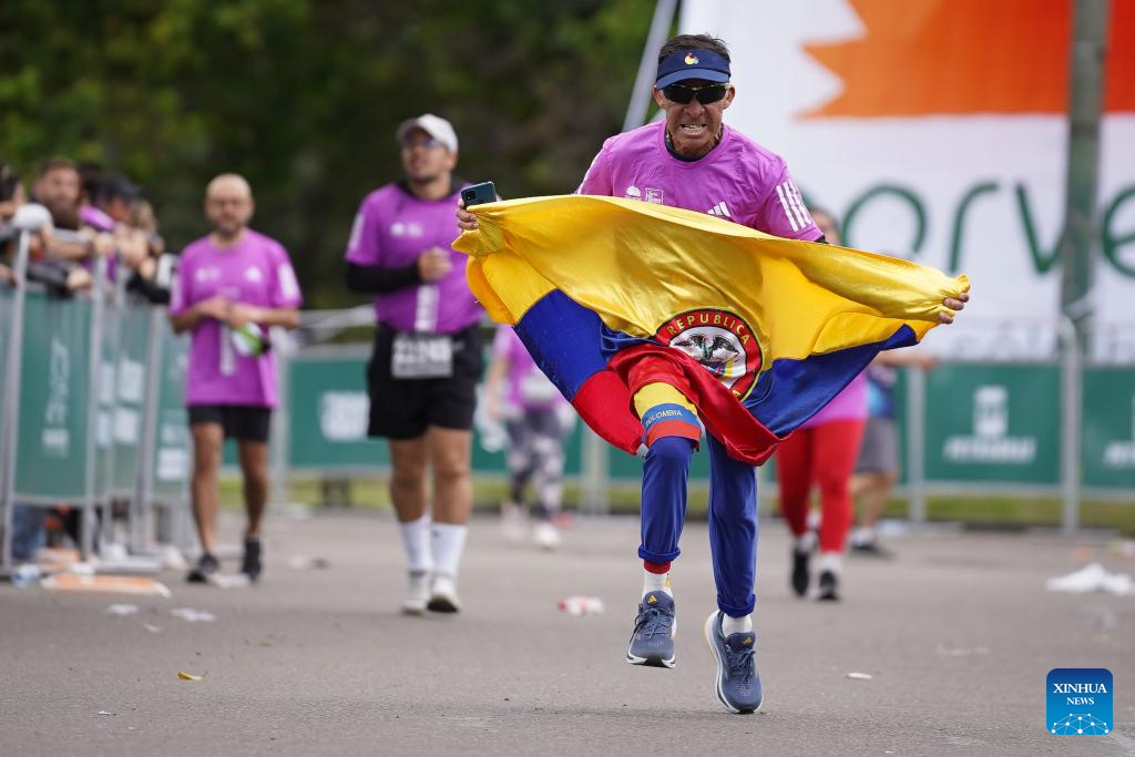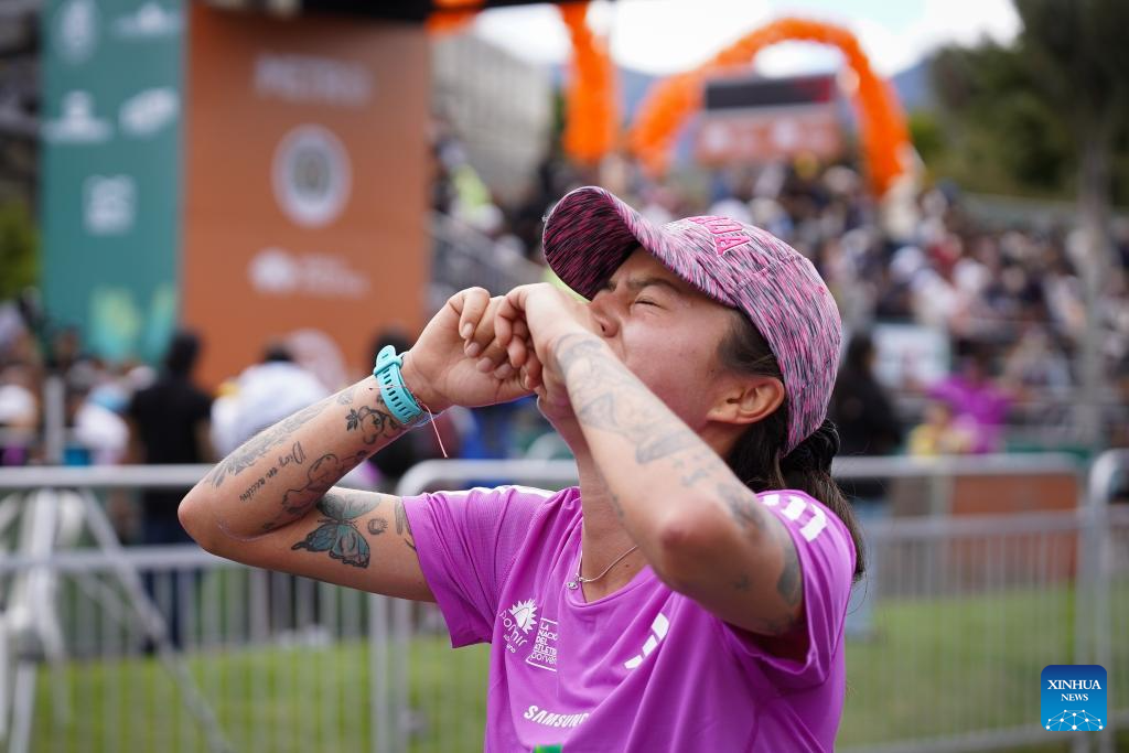 BOGOTA, 28 julio, 2025 (Xinhua) -- Imagen del 27 de julio de 2025 de una mujer reaccionando a su llegada a la meta del Medio Maratón de Bogotá, en Bogotá, capital de Colombia. La edición anual del Medio Maratón de Bogotá cumplió el domingo 25 años como la principal carrera atlética llevada a cabo en calles y avenidas de la capital de Colombia, según difundieron los organizadores. (Xinhua/Andrés Moreno)