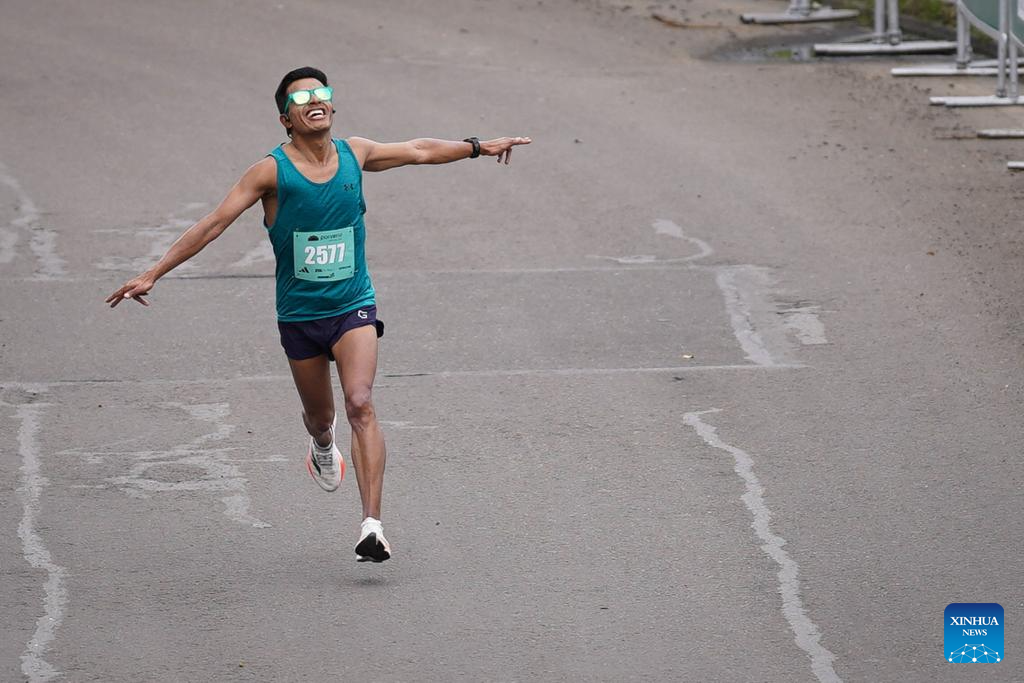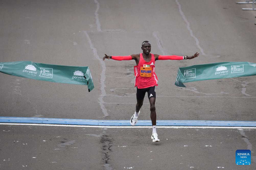 BOGOTA, 28 julio, 2025 (Xinhua) -- Imagen del 27 de julio de 2025 del atleta keniano, Philemon Kiplimo, cruzando la meta del Medio Maratón de Bogotá, en Bogotá, capital de Colombia. La edición anual del Medio Maratón de Bogotá cumplió el domingo 25 años como la principal carrera atlética llevada a cabo en calles y avenidas de la capital de Colombia, según difundieron los organizadores. (Xinhua/Andrés Moreno)