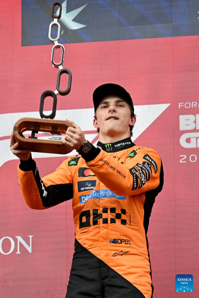 STAVELOT, 28 julio, 2025 (Xinhua) -- Imagen del 27 de julio de 2025 del piloto australiano de la escudería McLaren, Oscar Piastri, sosteniendo el trofeo durante la ceremonia de premiación de la carrera del Gran Premio de Bélgica de Fórmula Uno, en el circuito de Spa-Francorchamps, en Stavelot, Bélgica. (Xinhua/Zhao Dingzhe)
