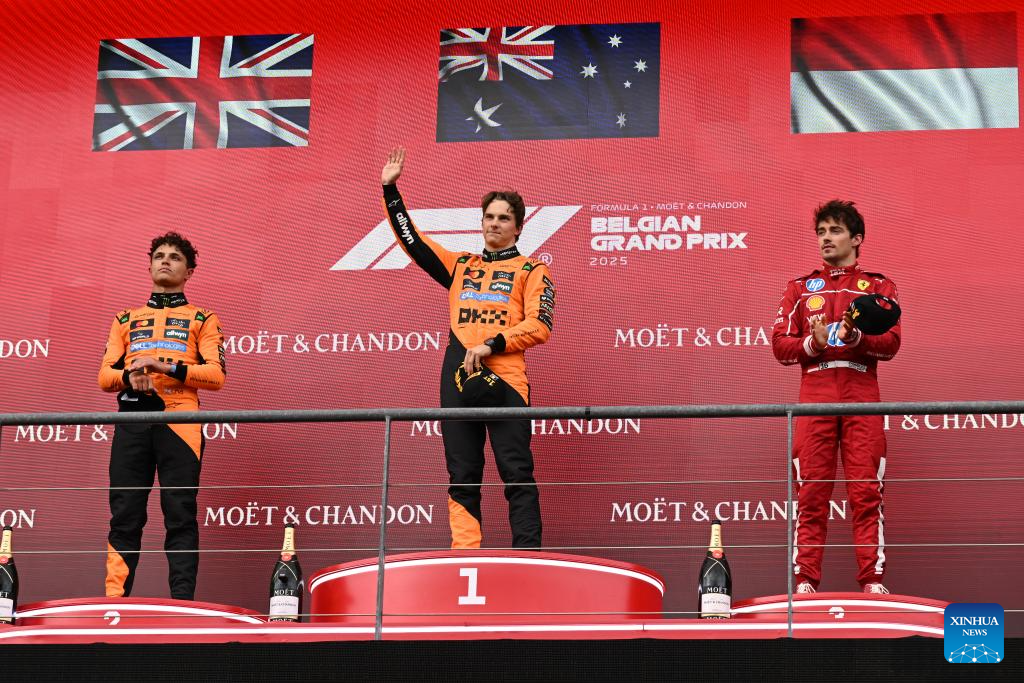 STAVELOT, 28 julio, 2025 (Xinhua) -- Imagen del 27 de julio de 2025 del ganador del primer lugar, el piloto australiano de la escudería McLaren, Oscar Piastri (c), el ganador del segundo lugar, el piloto británico de la escudería McLaren, Lando Norris (i), y el ganador del tercer lugar, el piloto monegasco de la escudería Ferrari, Charles Leclerc, reaccionando durante la ceremonia de premiación de la carrera del Gran Premio de Bélgica de Fórmula Uno, en el circuito de Spa-Francorchamps, en Stavelot, Bélgica. (Xinhua/Zhao Dingzhe)