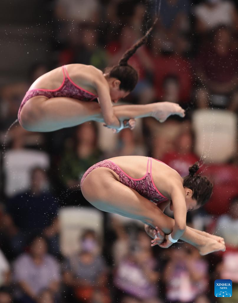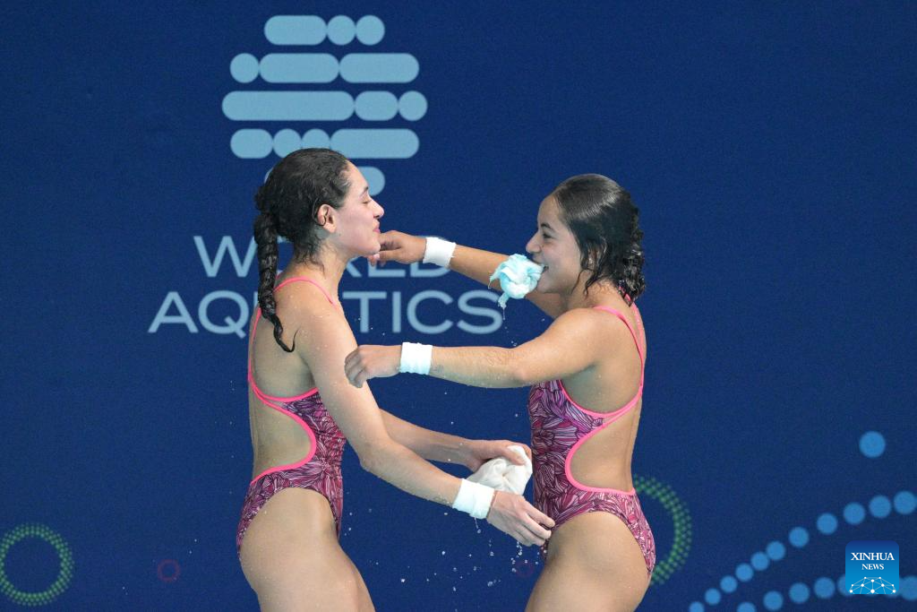 SINGAPUR, 28 julio, 2025 (Xinhua) -- Alejandra Estudillo Torres/Gabriela Agúndez García, de México, compiten durante la final de 10m sincronizados femeninos de clavados, en el Campeonato Mundial de Deportes Acuáticos, en Singapur, el 28 de julio de 2025. (Xinhua/Luo Yuan)