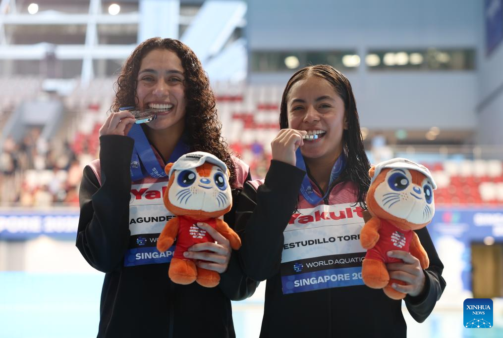 SINGAPUR, 28 julio, 2025 (Xinhua) -- Las medallistas de plata, Alejandra Estudillo Torres (d)/Gabriela Agúndez García, de México, posan al término de la ceremonia de premiación de la final de 10m sincronizados femeninos de clavados, en el Campeonato Mundial de Deportes Acuáticos, en Singapur, el 28 de julio de 2025. (Xinhua/Luo Yuan)