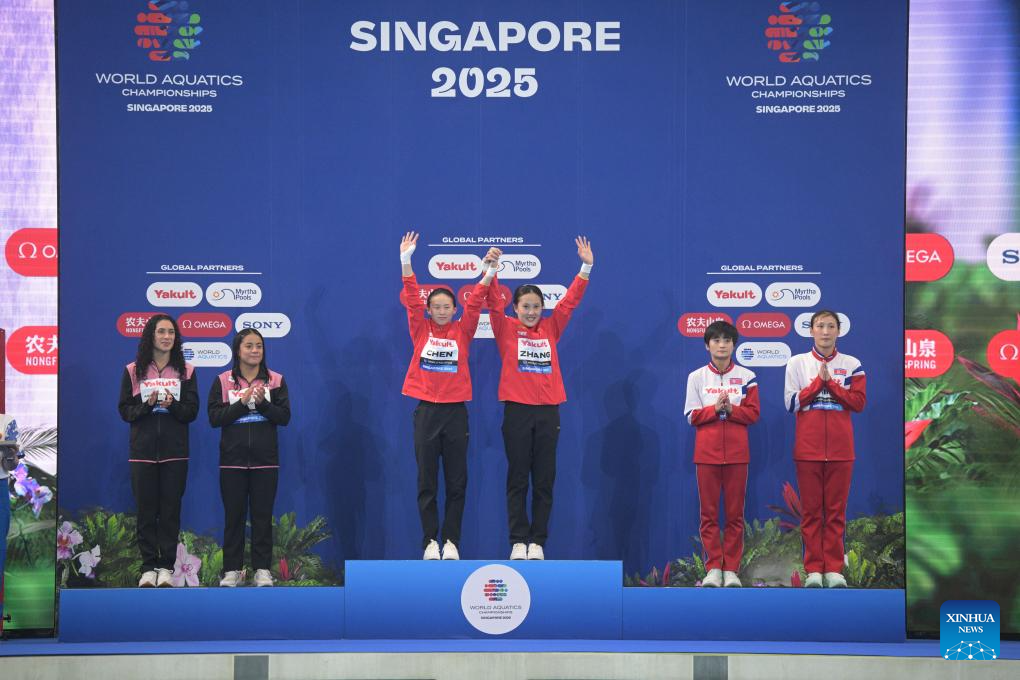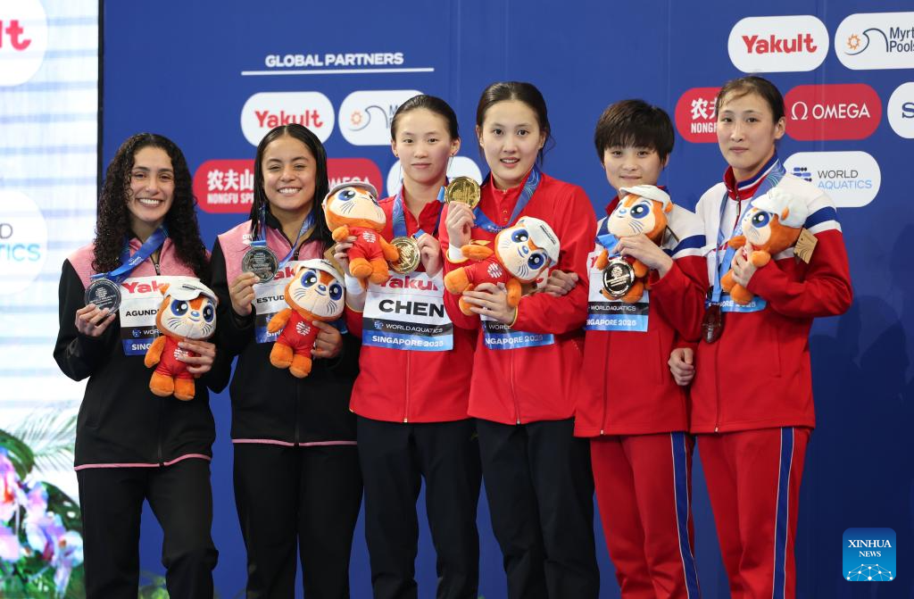 SINGAPUR, 28 julio, 2025 (Xinhua) -- Las medallistas de oro, Chen Yuxi (3-i)/Zhang Minjie (3-d), de China, las medallistas de plata, Alejandra Estudillo Torres (2-i)/Gabriela Agúndez García (i), de México, y las medallistas de bronce, Kim Mi Hwa (d)/Jo Jin Mi, de República Popular Democrática de Corea, posan durante la ceremonia de premiación de la final de 10m sincronizados femeninos de clavados, en el Campeonato Mundial de Deportes Acuáticos, en Singapur, el 28 de julio de 2025. (Xinhua/Then Chih Wey)