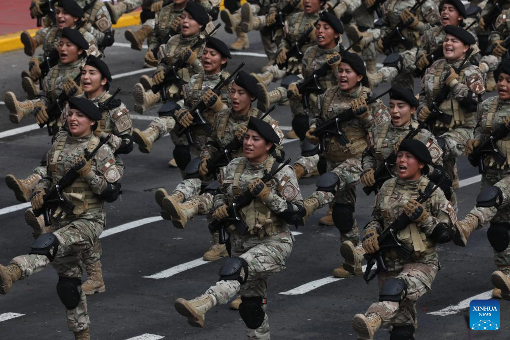LIMA, 29 julio, 2025 (Xinhua) -- Mujeres soldado de la Fuerza Aérea del Perú participan en la Gran Parada y Desfile Cívico Militar 2025 con motivo de la celebración de los 204 años de la independencia nacional, en Lima, Perú, el 29 de julio de 2025. (Xinhua/Mariana Bazo)