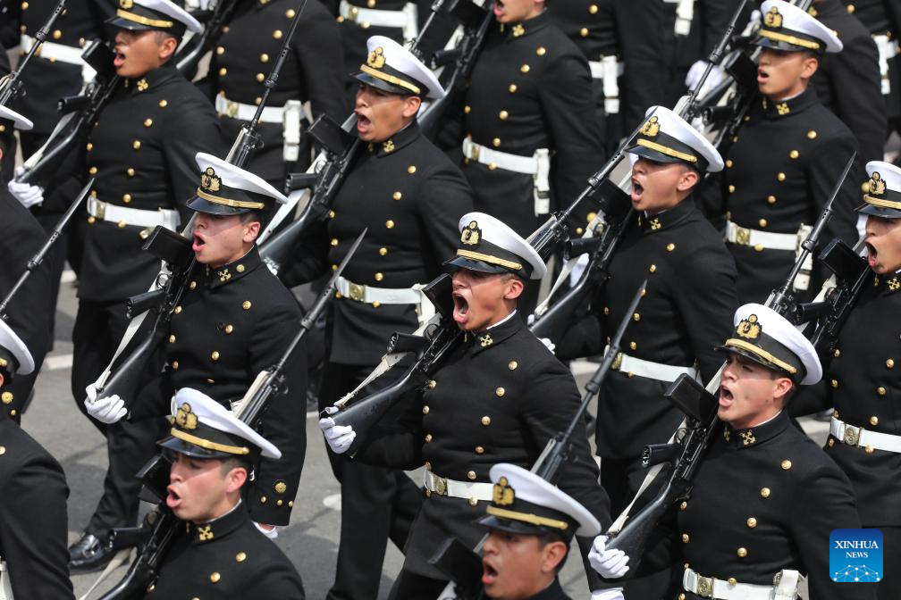 LIMA, 29 julio, 2025 (Xinhua) -- Elementos de la Marina peruana participan en la Gran Parada y Desfile Cívico Militar 2025 con motivo de la celebración de los 204 años de la independencia nacional, en Lima, Perú, el 29 de julio de 2025. (Xinhua/Mariana Bazo)