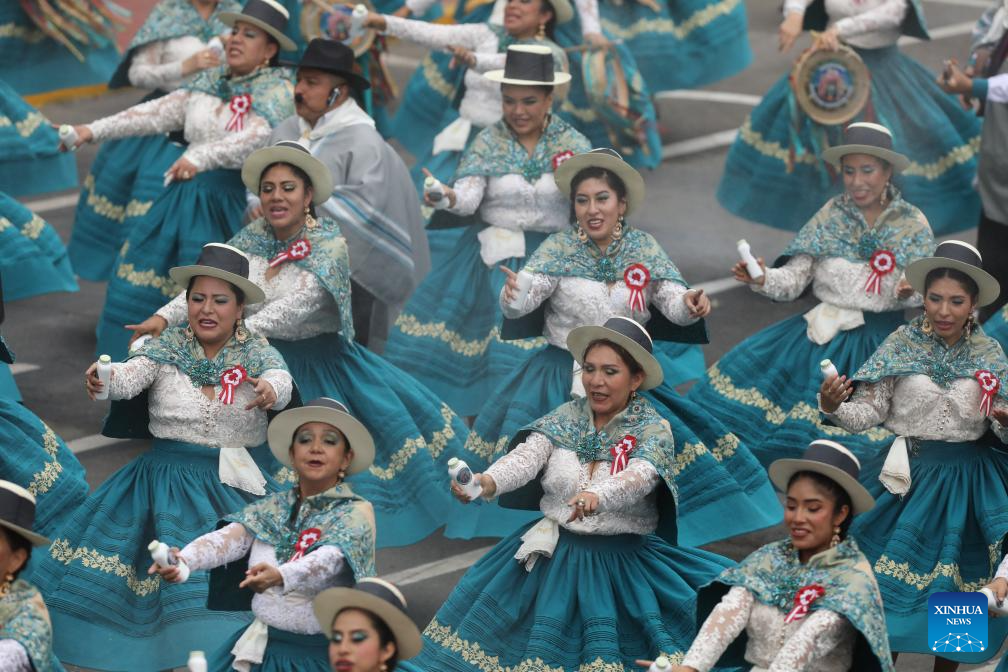 LIMA, 29 julio, 2025 (Xinhua) -- Bailarinas del carnaval andino participan en la Gran Parada y Desfile Cívico Militar 2025 con motivo de la celebración de los 204 años de la independencia nacional, en Lima, Perú, el 29 de julio de 2025. (Xinhua/Mariana Bazo)