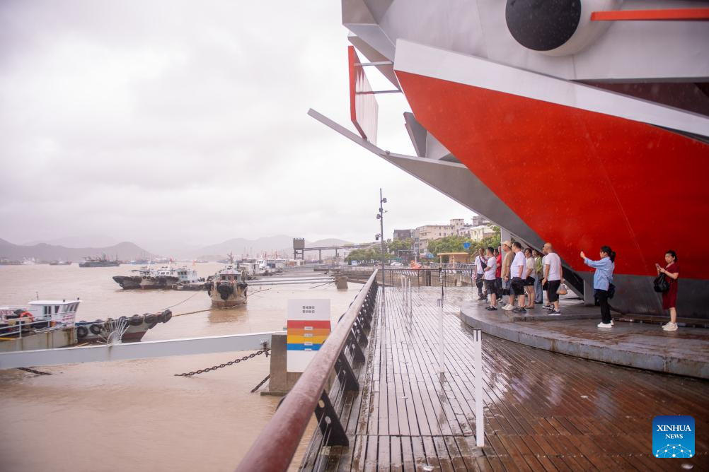 NINGBO, 29 julio, 2025 (Xinhua) -- Turistas se resguardan de la lluvia, en el distrito de Xiangshan de Ningbo, en la provincia de Zhejiang, en el este de China, el 29 de julio de 2025. El tifón Co-May, el octavo tifón de este año, trajo fuertes lluvias al distrito de Xiangshan de Ningbo. Los barcos locales han regresado al puerto para refugiarse y se han suspendido los servicios de ferry. (Xinhua/Jiang Han)